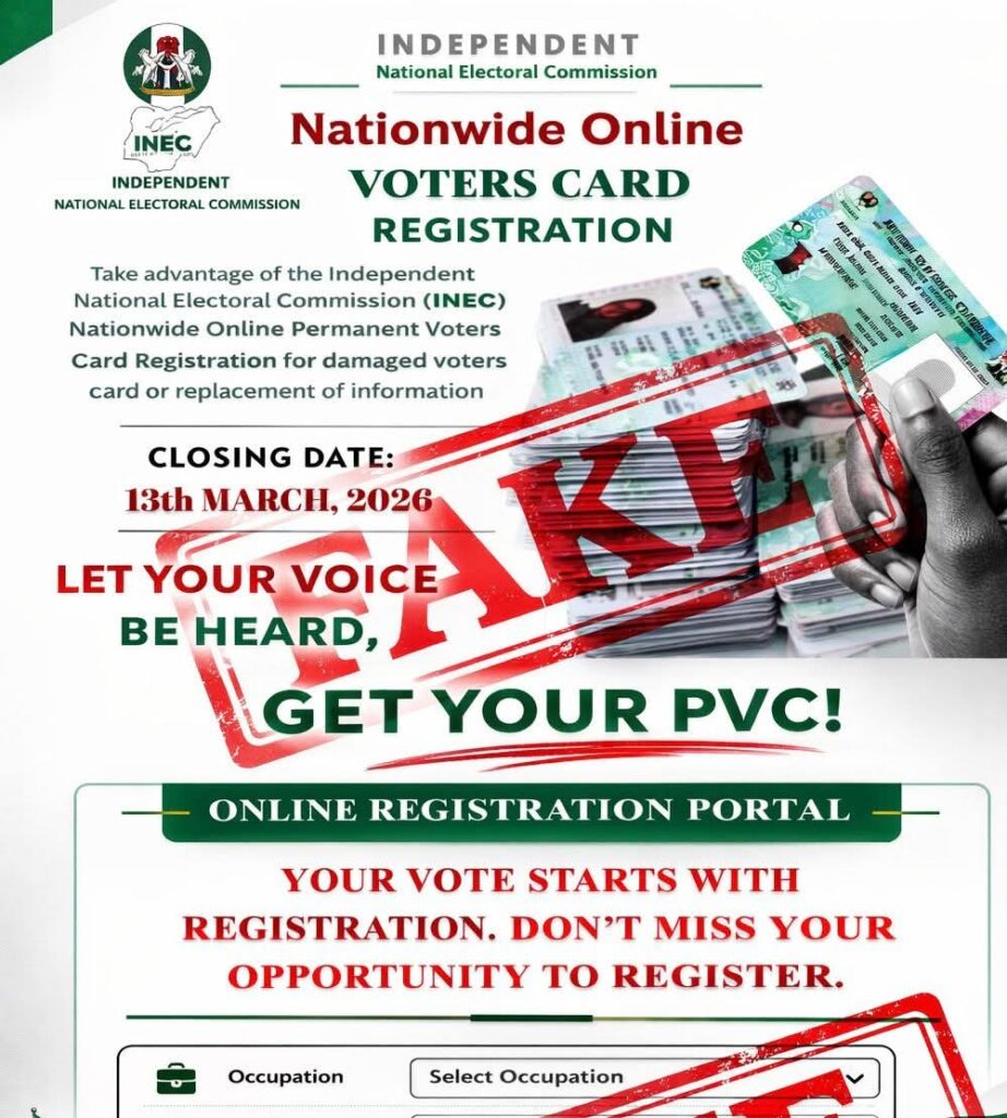 According to the notice, INEC did not create, approve, or endorse the link currently being shared, including the URL: https://tinyurl.com/INEC-PVC-Registration-2026.