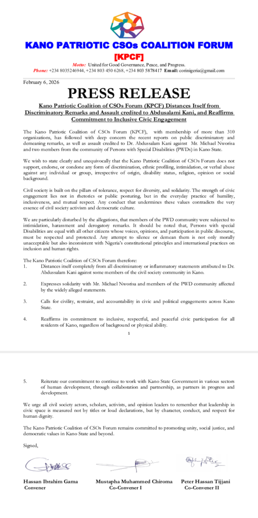 In a press release dated February 6, 2026, the Kano Patriotic Coalition of CSOs Forum (KPCF) expressed deep concern over reports of intimidation, verbal abuse, and assault allegedly directed at Mr. Nworisa Michael and members of the Persons with Special Disabilities (PWDs) community in Kano.